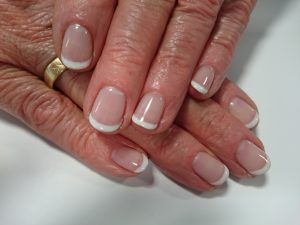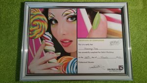 Na het inoefenen en een deugddoende pauze met lekkere cake en koffie of fris, was het tijd voor het “echte” werk. 10 vingers in een techniek naar keuze. Lekker de tijd en kans om mijn smileys te oefenen. En het ging me eerlijk gezegd goed af! Tevreden met het resultaat en een welverdiend certificaat vertrokken we terug richting huiswaarts. En ook mijn model was super tevreden. Zij heeft er 3 weken plezier van gehad 😉